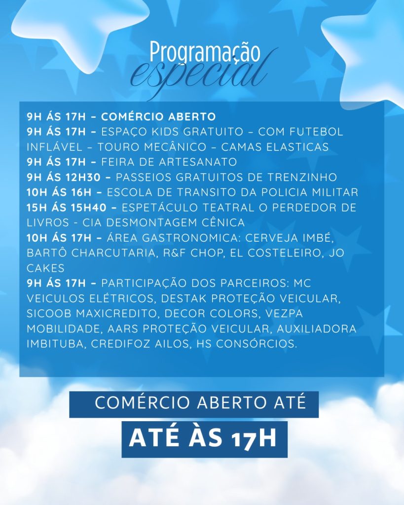 A ação tem como objetivo movimentar o centro da cidade, fortalecendo o comércio e proporcionando lazer, cultura e diversão para toda a comunidade. Durante todo o dia, o público poderá aproveitar o Espaço Kids gratuito, com futebol, touro mecânico e camas elásticas, além da Feira de Artesanato e dos passeios gratuitos de trenzinho, que acontecem das 9h às 12h30.