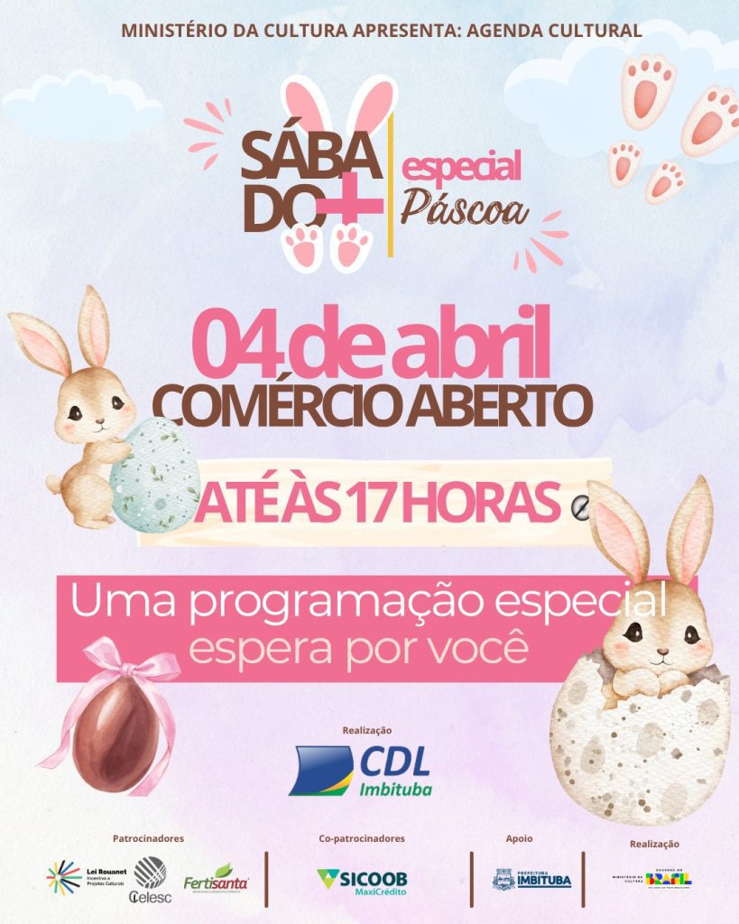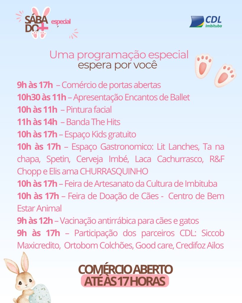 A CDL Imbituba realiza no próximo sábado, dia 04 de abril de 2026, mais uma edição do tradicional Sábado Mais, desta vez em clima especial de Páscoa. A ação promete movimentar o comércio local e proporcionar um dia repleto de atrações para toda a comunidade.