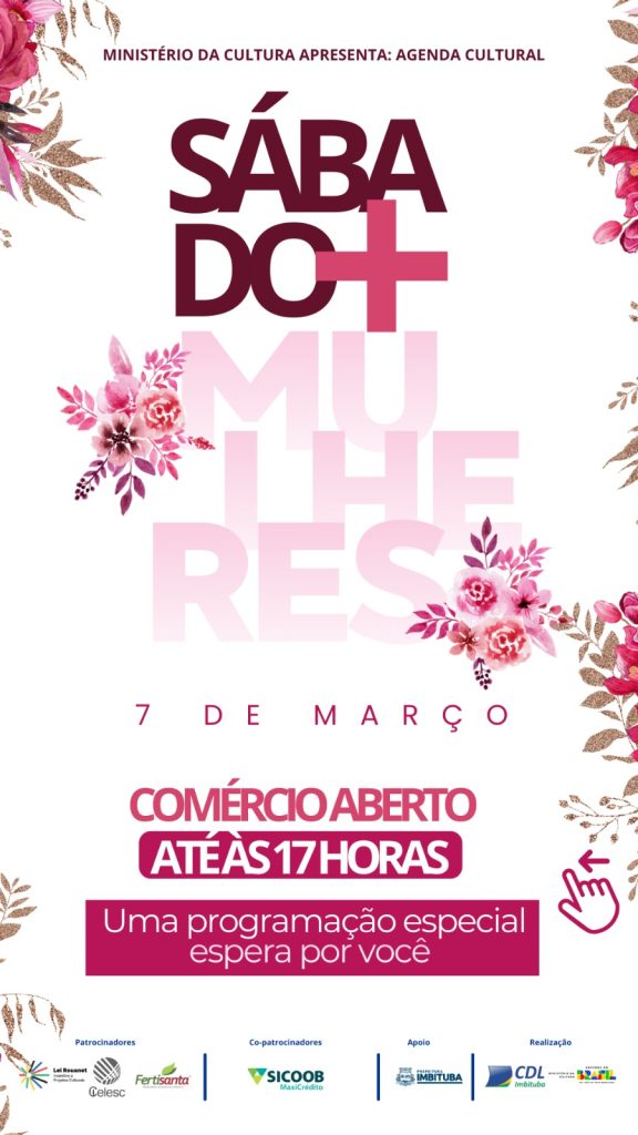 No próximo sábado, dia 7 de março de 2026, a CDL Imbituba promove mais uma edição do tradicional Sábado Mais, desta vez em alusão ao Dia Internacional da Mulher. A programação acontece ao longo de todo o dia, reunindo comércio aberto, atrações culturais, serviços gratuitos e diversas ações voltadas à comunidade.