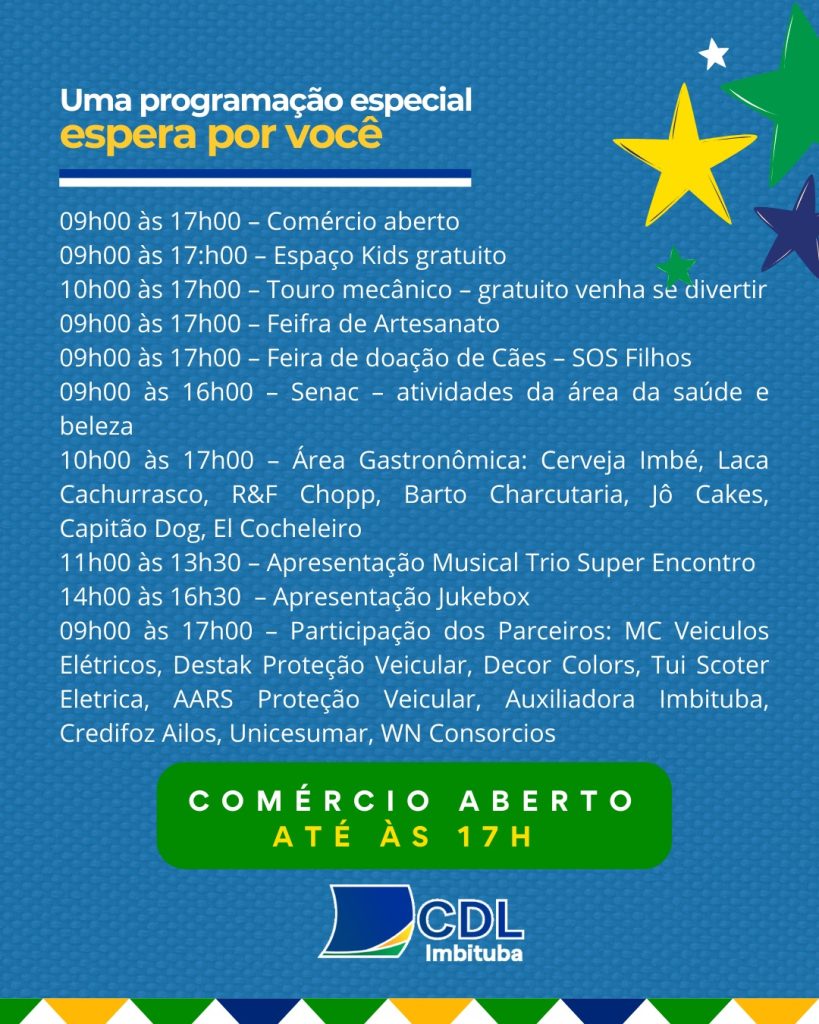 👉 O evento é uma realização da CDL Imbituba, por meio do Ministério da Cultura, com patrocínio da CELESC e Fertisanta, e apoio da Sicoob Maxicrédito e da Prefeitura Municipal de Imbituba.