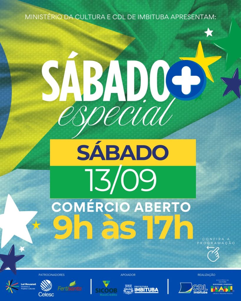 O próximo sábado, dia 13 de setembro, promete movimentar o comércio e o centro de Imbituba com mais uma edição do Sábado Mais, evento que reúne lazer, cultura, gastronomia, música e muita diversão para toda a família, além do comércio aberto em horário especial das 09h às 17h.