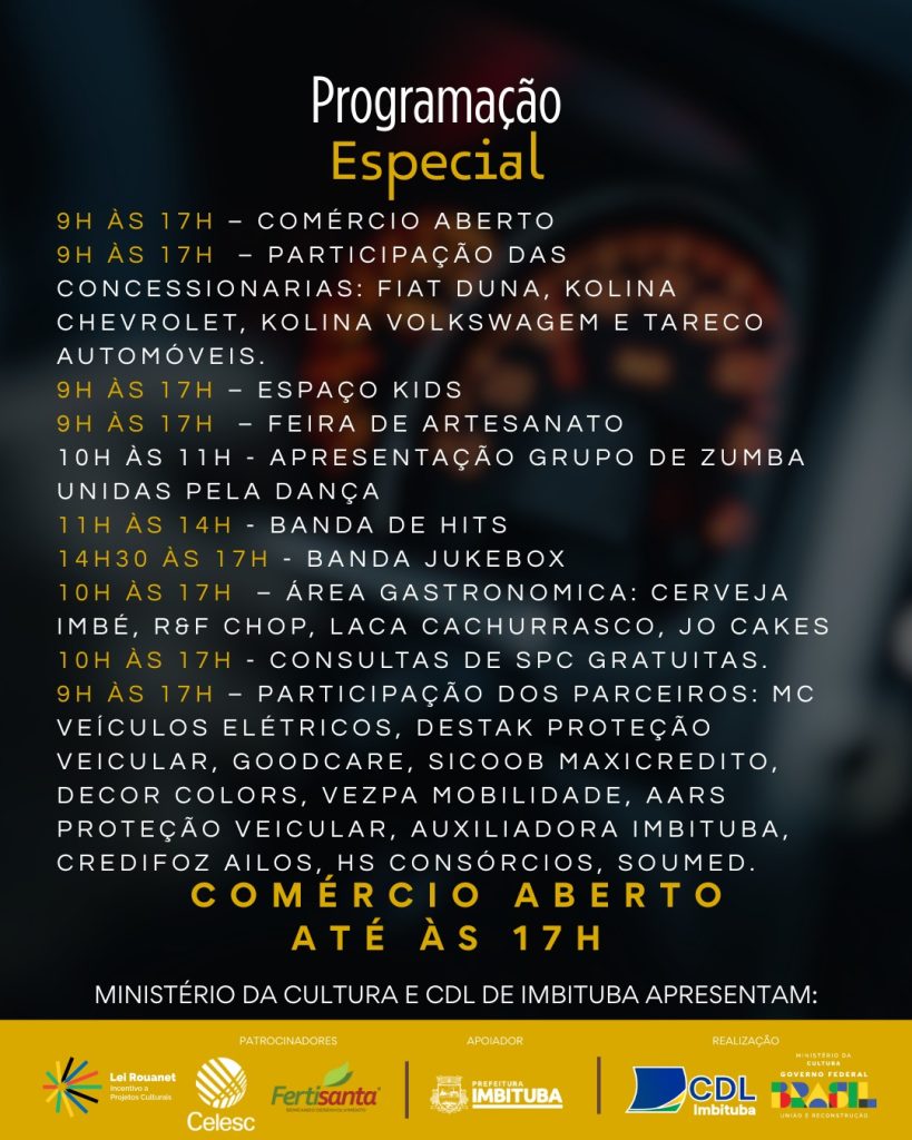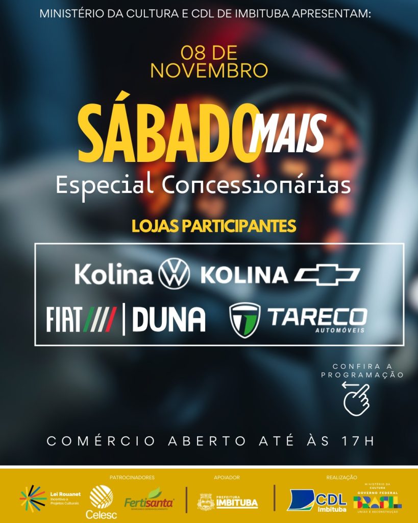 O Sábado Mais CDL Imbituba é uma realização da CDL Imbituba, por meio do Ministério da Cultura, com patrocínio da CELESC e Fertisanta, e apoio da Sicoob Maxicrédito e da Prefeitura Municipal de Imbituba.